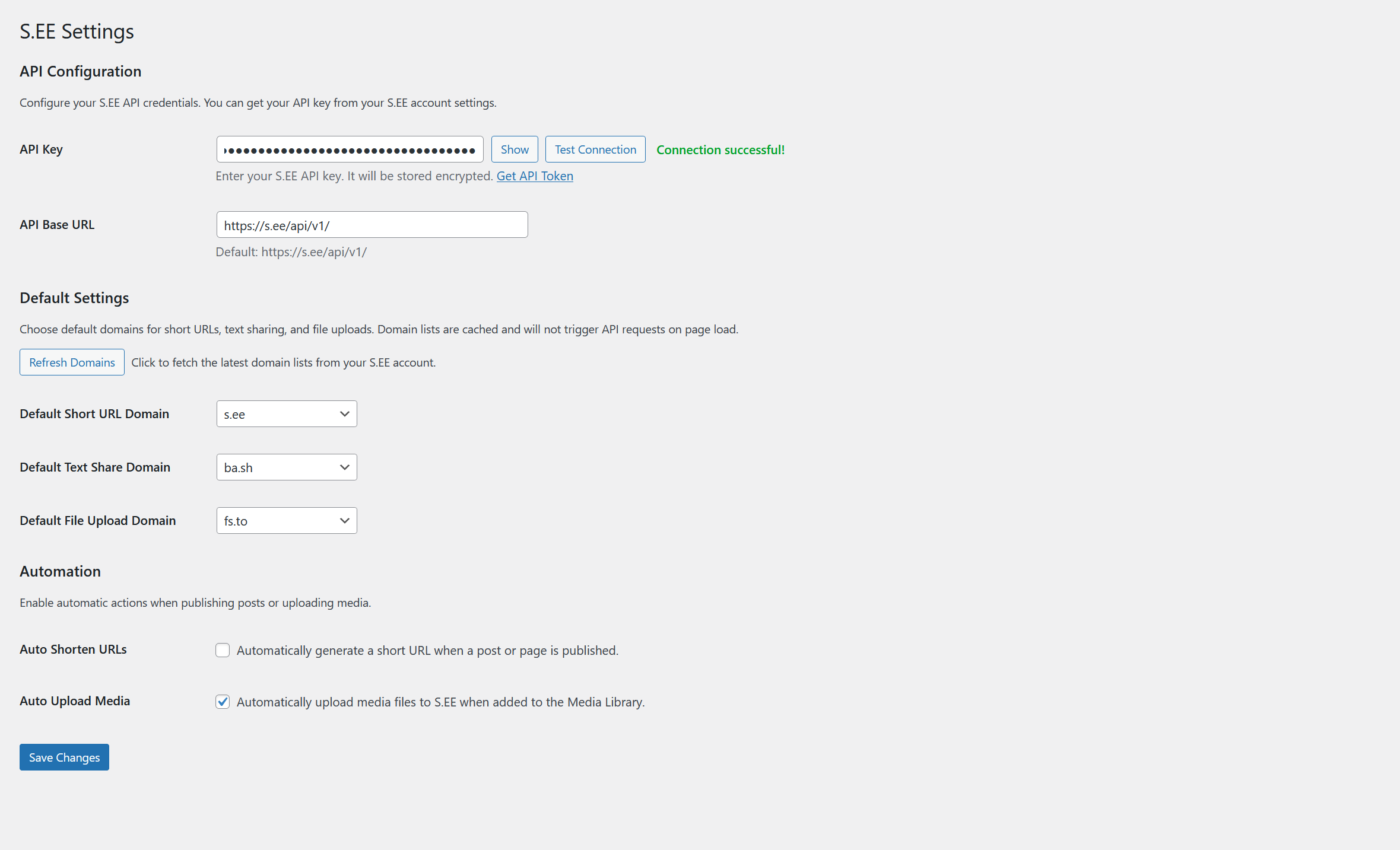 This plugin connects to the S.EE API to provide URL shortening, text sharing, and file hosting services. All core functionality depends on this external service.