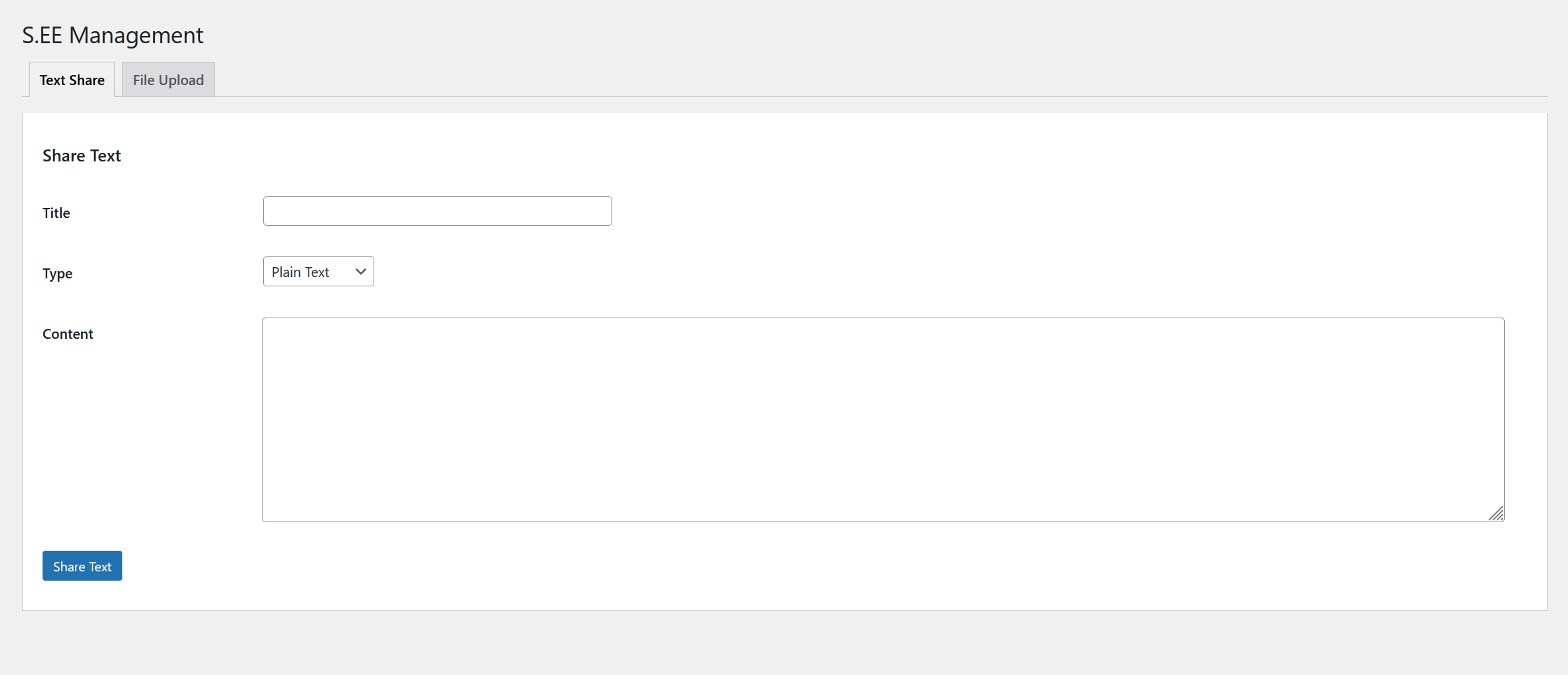 - Management page for standalone text sharing and file uploads.