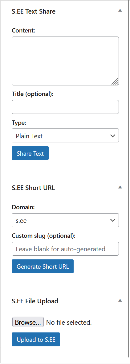 S.EE is a platform that provides URL shortening, text sharing (paste), and file hosting services. This plugin integrates these services into the WordPress admin dashboard.