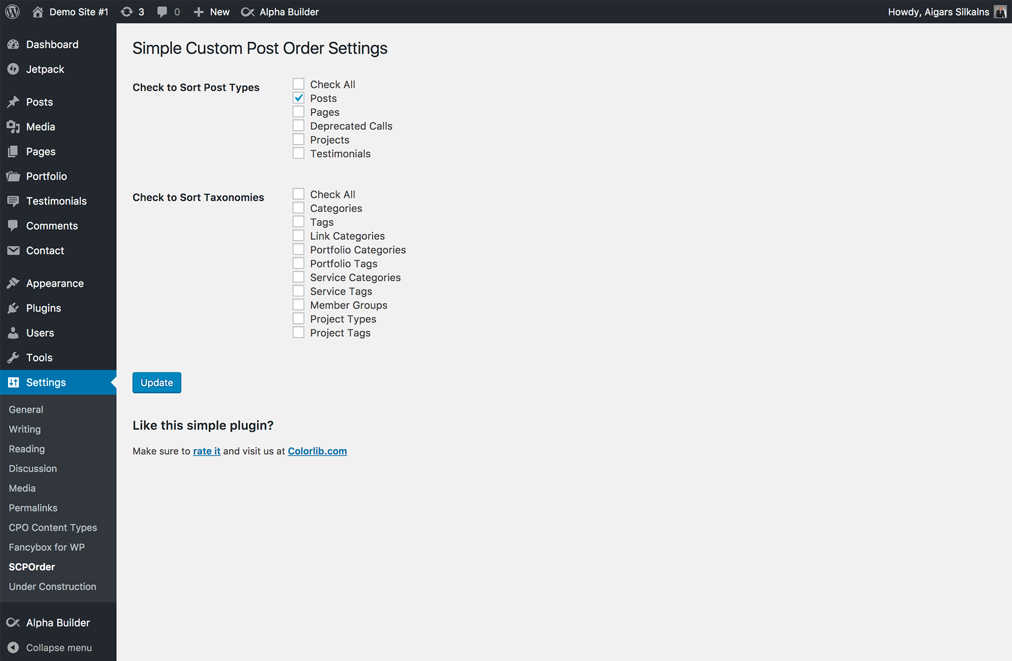 - Configure – Go to Settings > SCPOrder and select which post types and taxonomies to enable