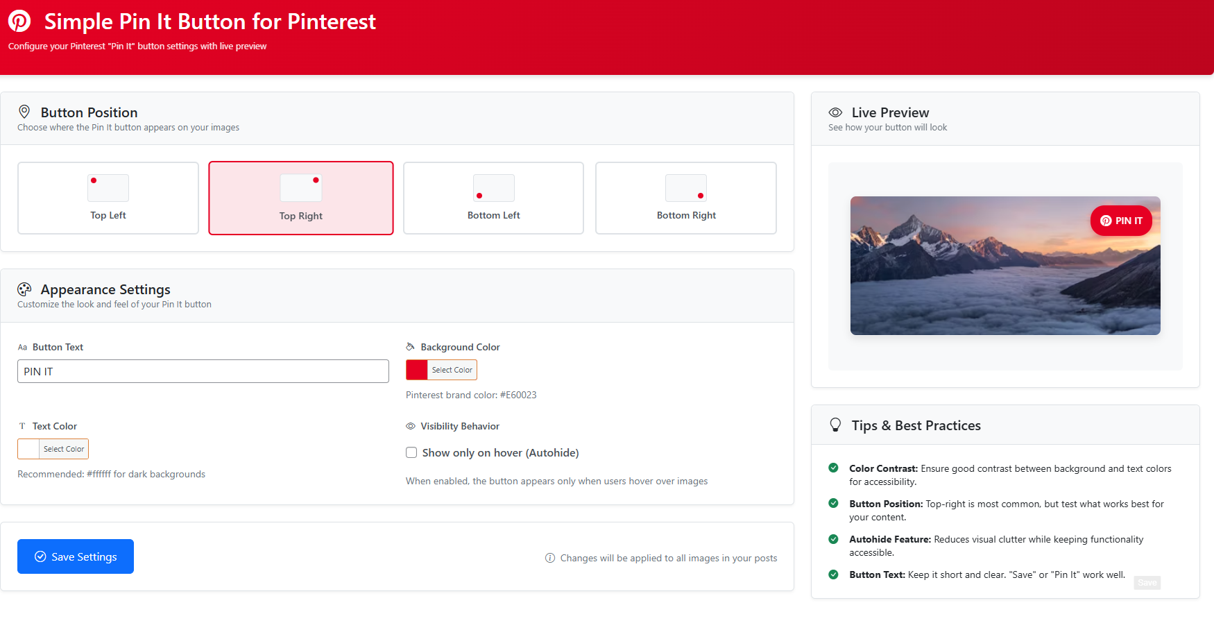 Simple Pin It Button for Pinterest is a lightweight WordPress plugin that allows you to add a “Pin It” button overlay to images in your posts. The button is fully customizable through the plugin settings page, where you can adjust: