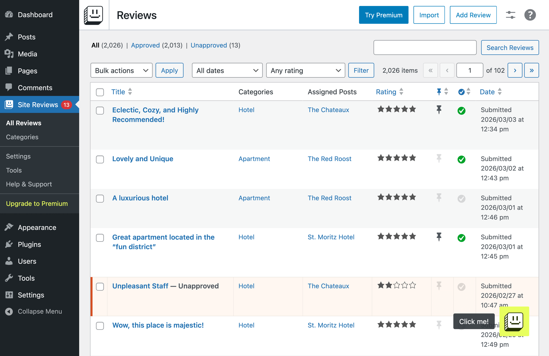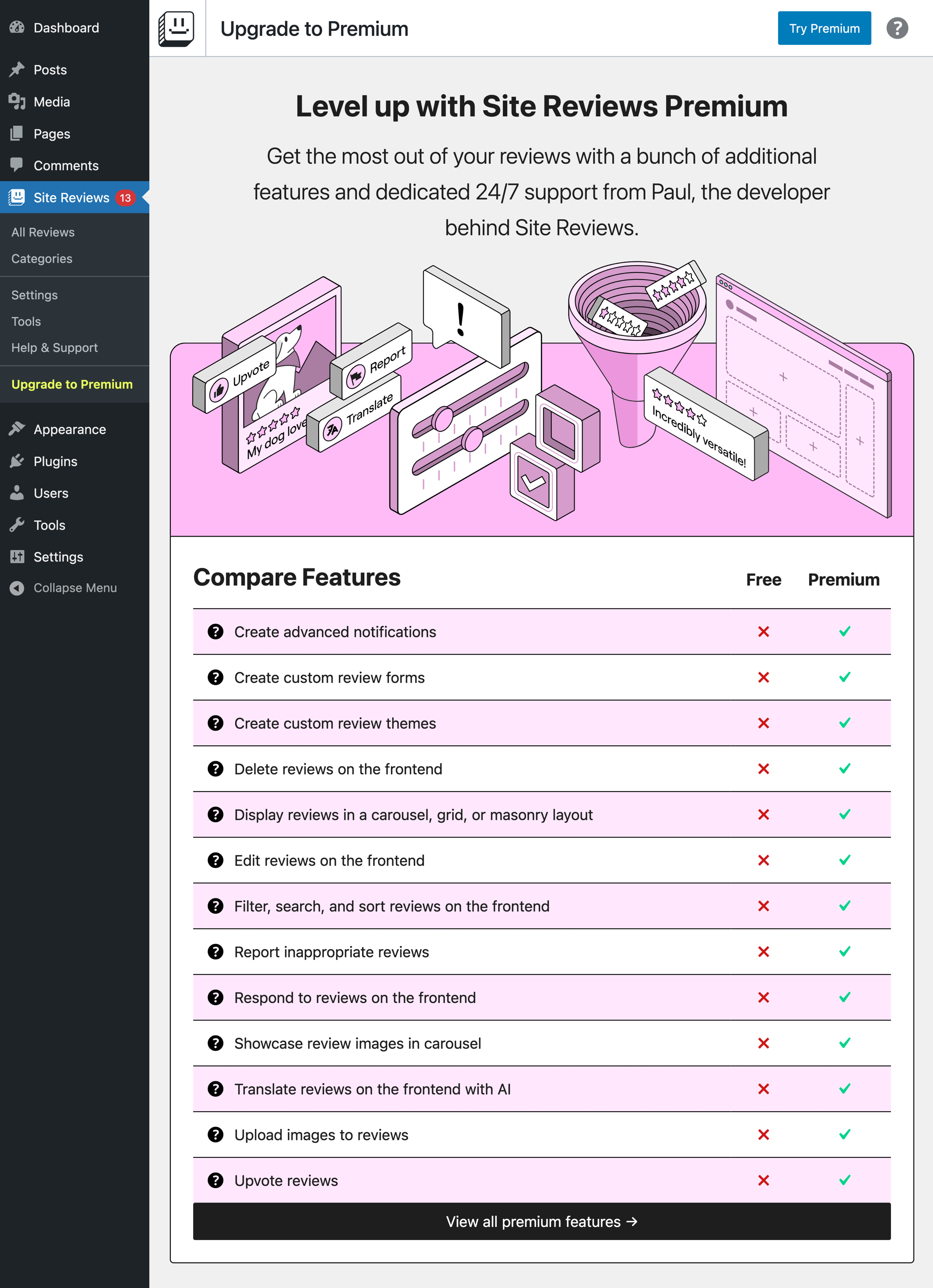 If you need more features, Site Reviews Premium gives you access to all of our paid addons as well as fast email and remote support.