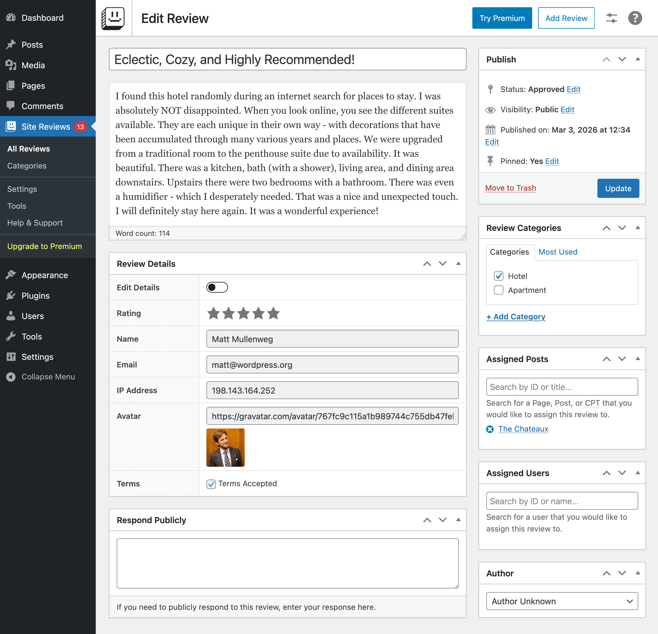 - Multilingual Plugin Support: Integrates review assignments with Polylang and WPML allowing you to assign reviews to all languages of a multilingual page (note: translating reviews is not supported)