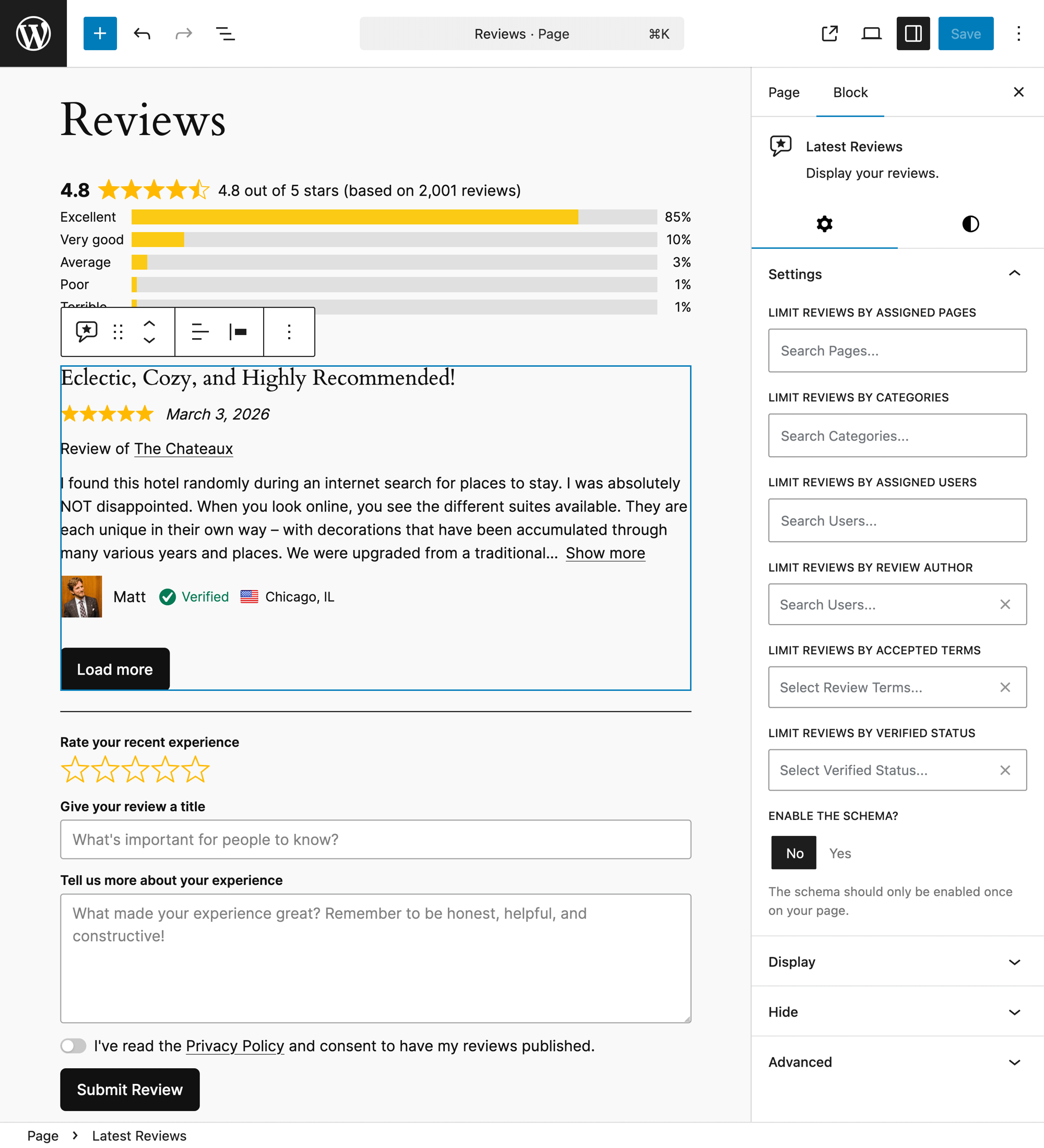 - Added an “author” option to the Latest Reviews and Rating Summary blocks and shortcodes to display ratings and reviews submitted by a specific user.