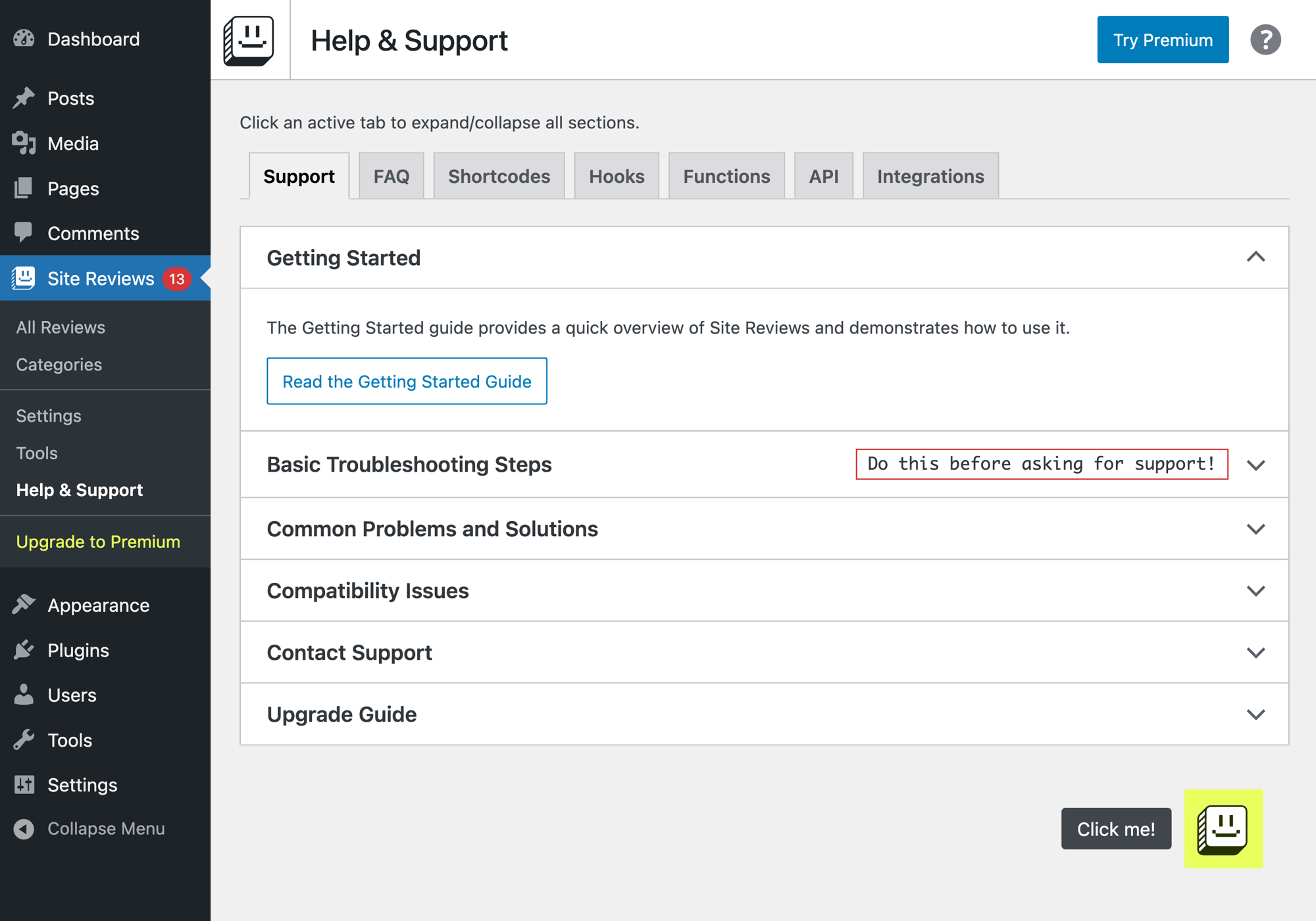 You can also read the “Getting Started” page by clicking the Help icon on the top-right corner of any of the Site Reviews admin pages.