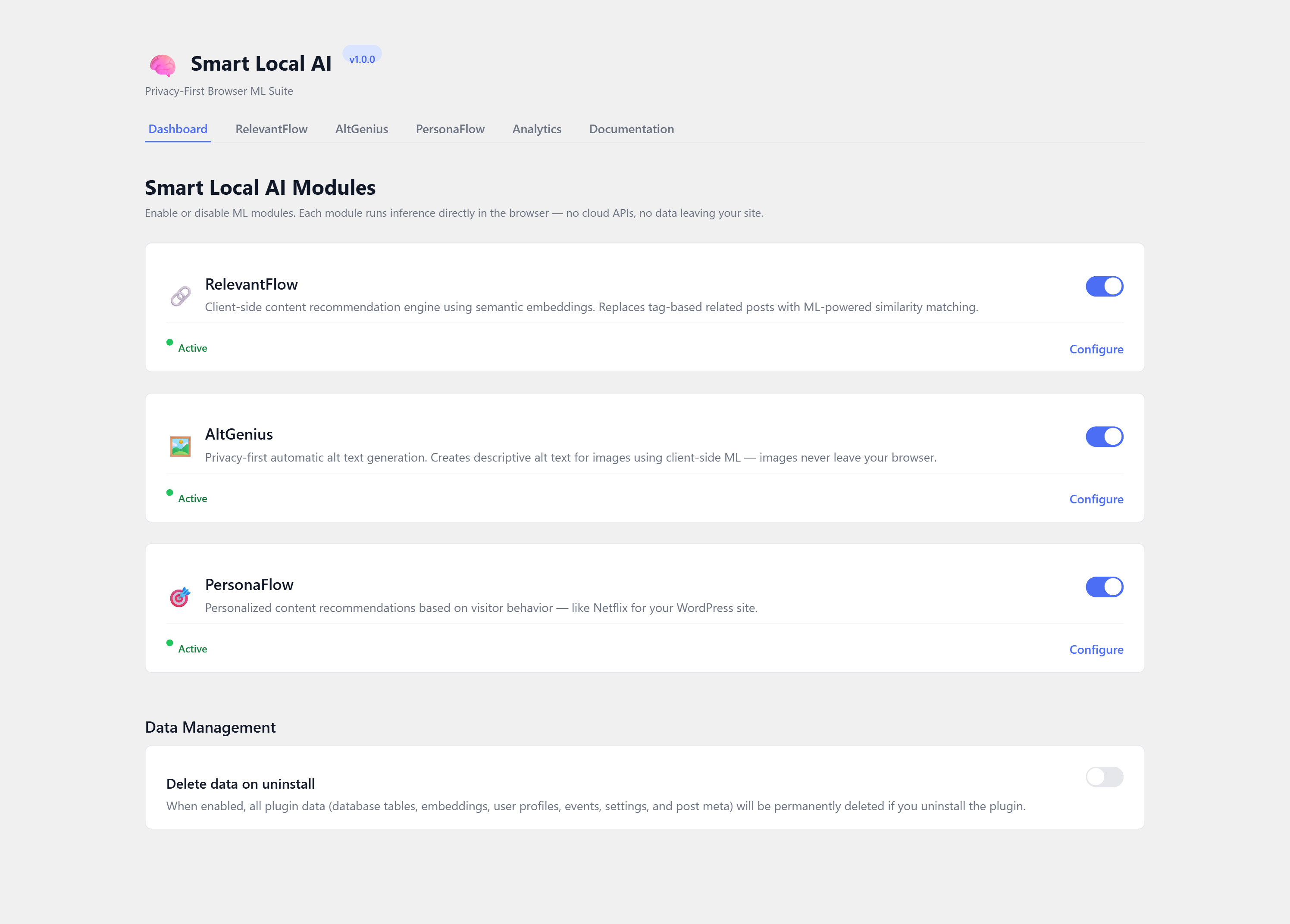 Smart Local AI brings machine learning directly to the browser. Every ML model runs on-device in the visitor’s or editor’s browser using Transformers.js and WebGPU/WASM. No data is ever sent to external servers, no cloud API keys are needed, and there are zero recurring costs.