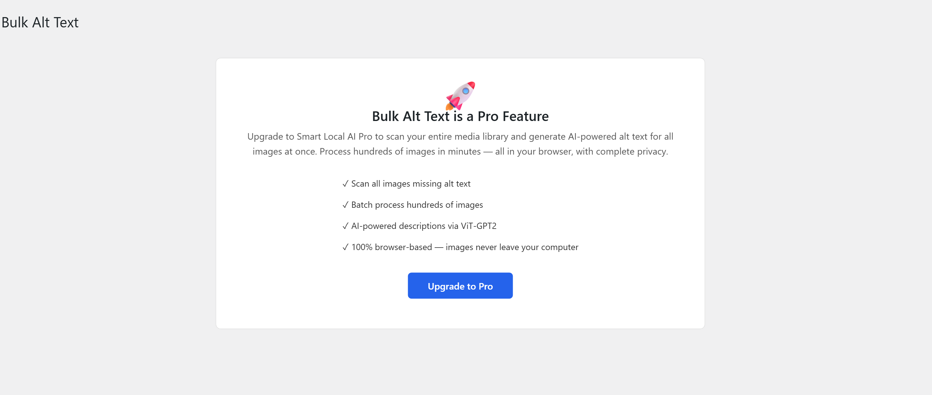 - Or go to Smart Local AI > Bulk Alt Text and click Start Bulk Scan to generate alt text for all existing images missing it