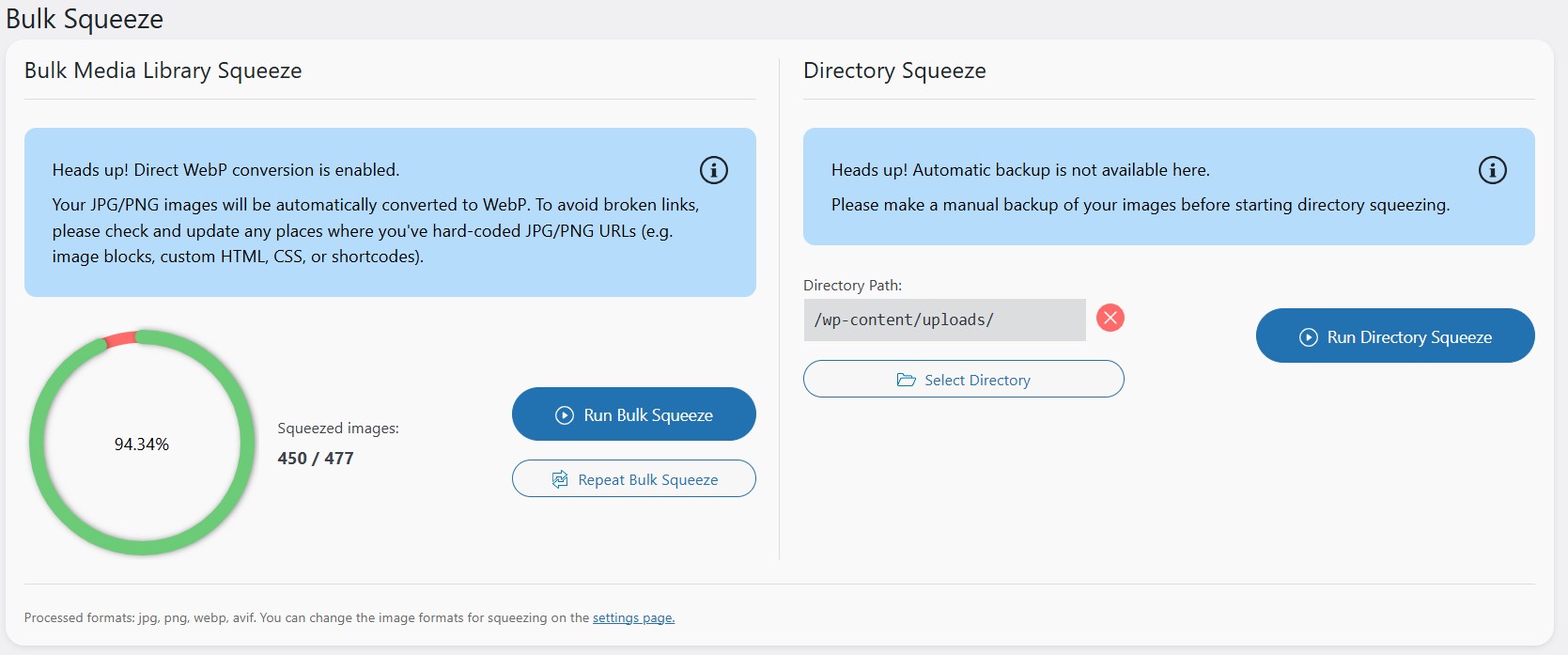 Squeeze plugin supports JPG, PNG, WEBP and AVIF image formats.