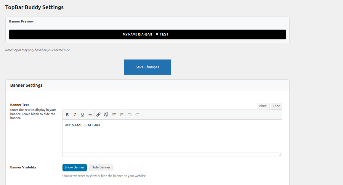 Go to TopBar Buddy in the admin sidebar. Type your message in the editor, choose your settings, and click Save Changes. Your banner will appear on the front end immediately.