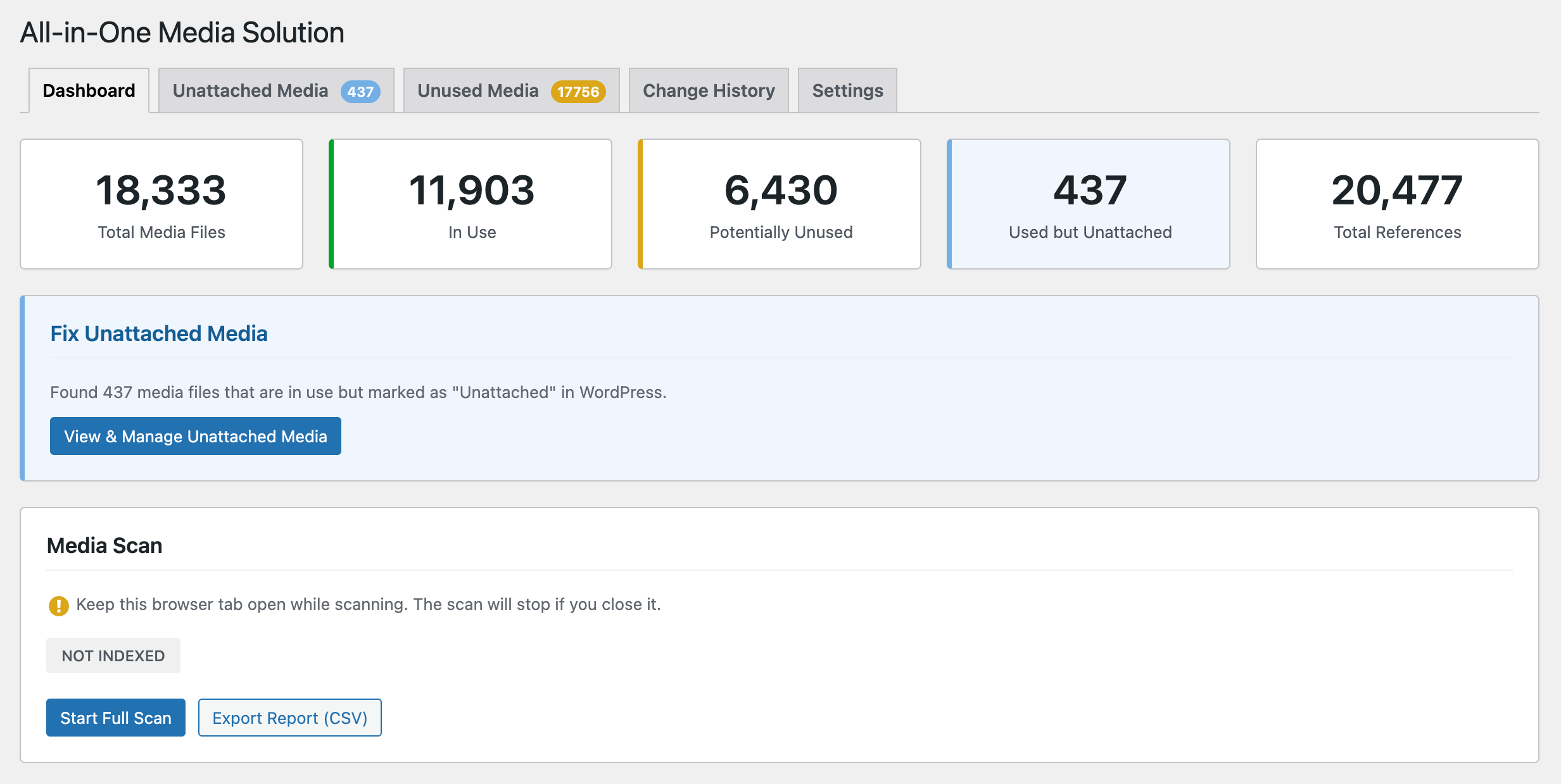 Dashboard - Overview of media usage statistics (Total Media Files, In Use, Unused, Unattached).