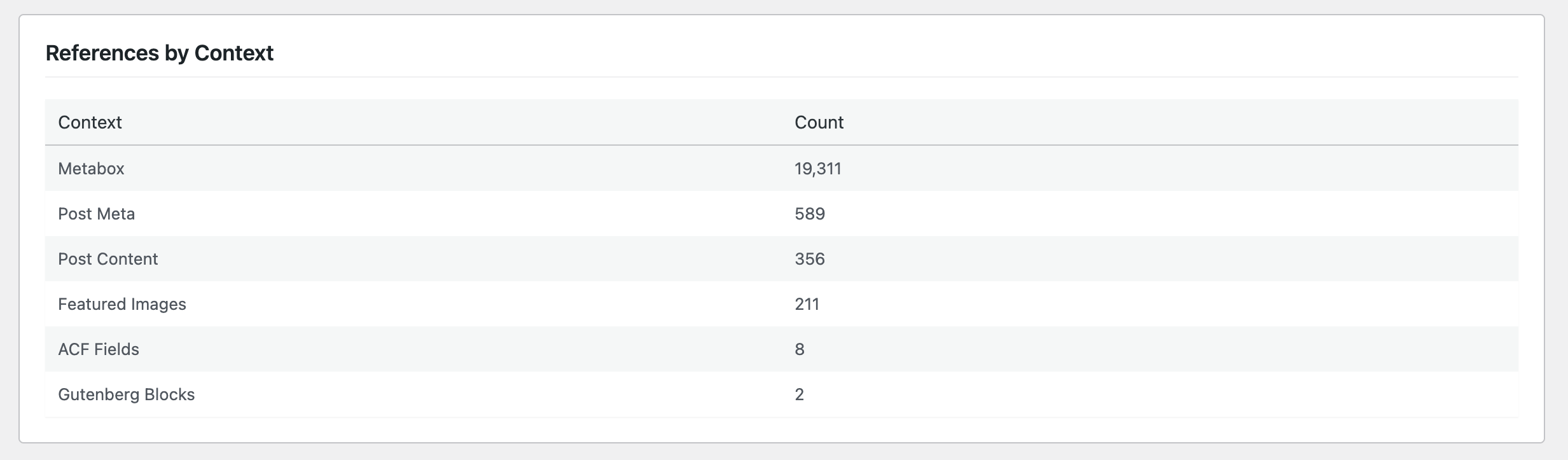 References by Context - Detailed breakdown of exactly where media is being used (Metabox, Post Content, Gutenberg, etc.).