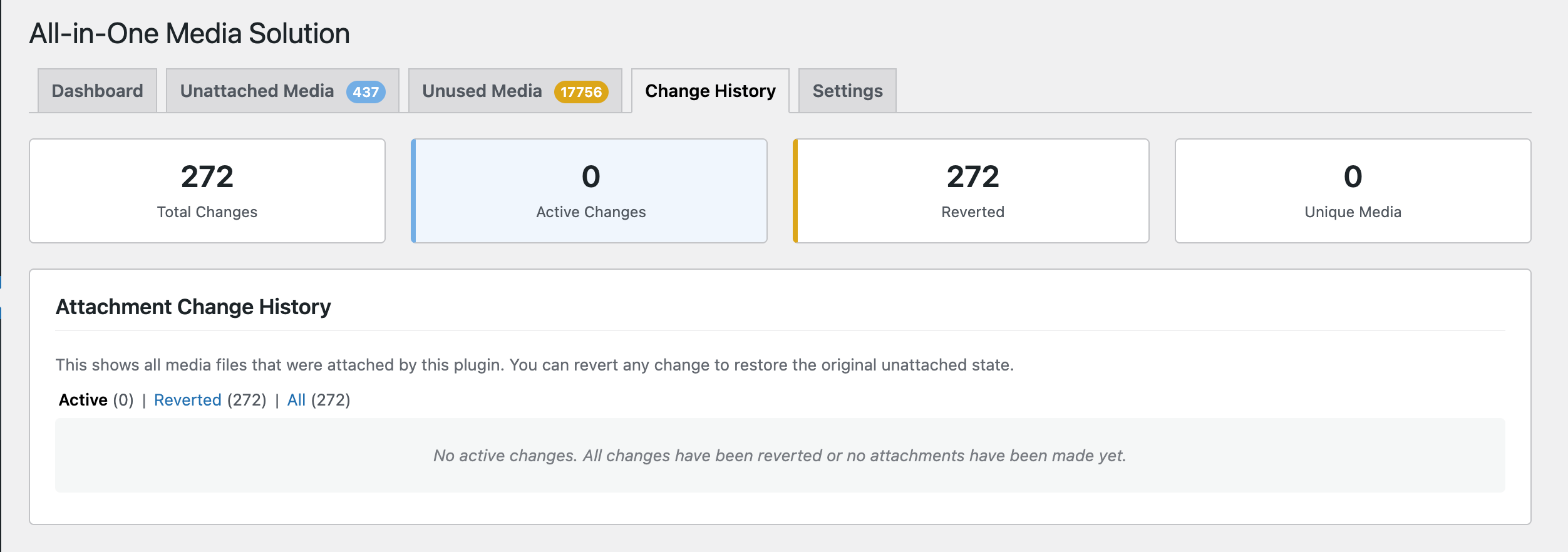 Note: Attachment relationships (post_parent) that were set by this plugin are NOT removed, as these are now part of WordPress’s native media library structure. If you need to revert these, use the Change History tab before uninstalling.