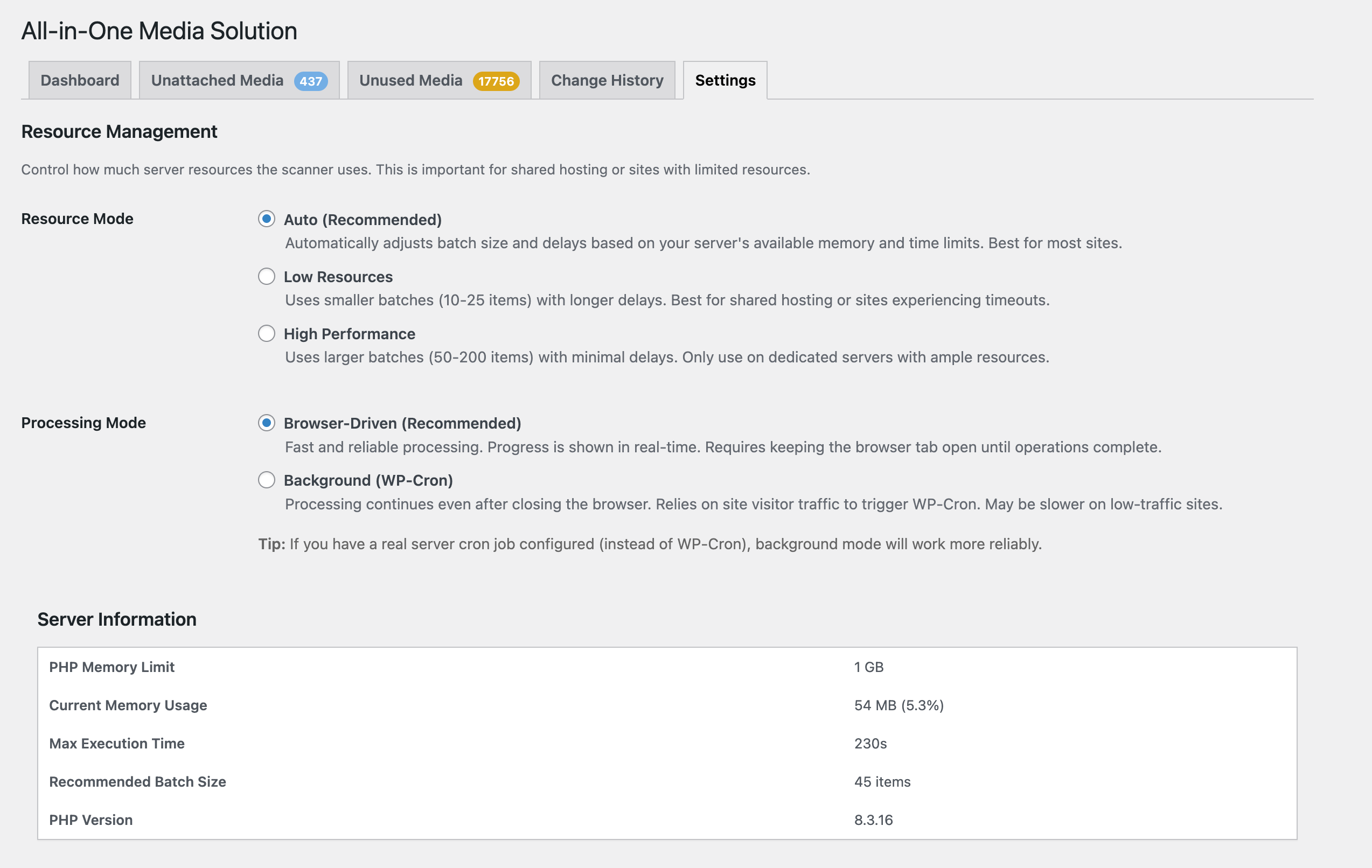 - Two processing strategies – Choose browser-driven (fast) or background WP-Cron mode