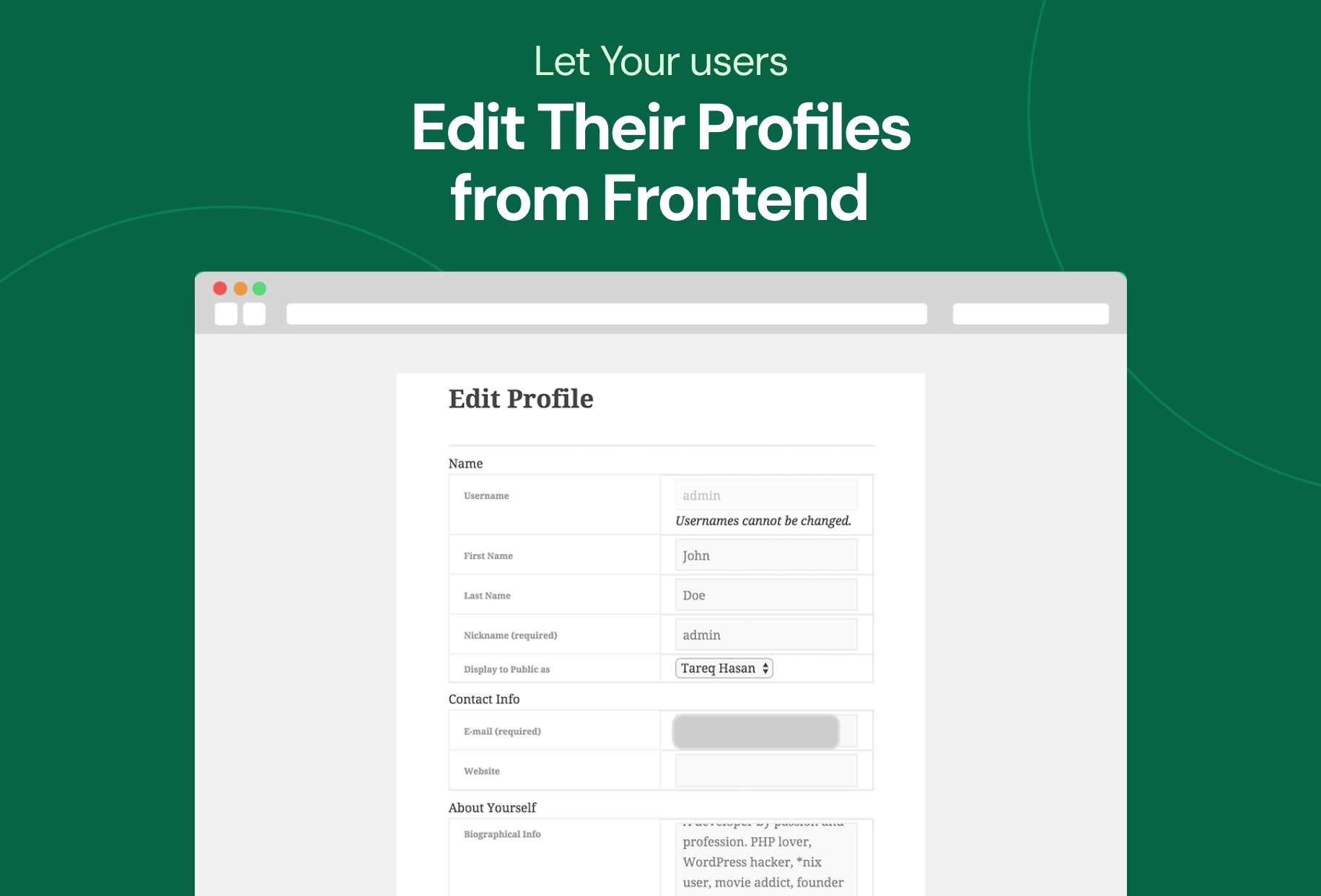 This WordPress Profile Plugin allows registered users to edit their profile using default fields from frontend. (Unlimited fields can be added using PRO)