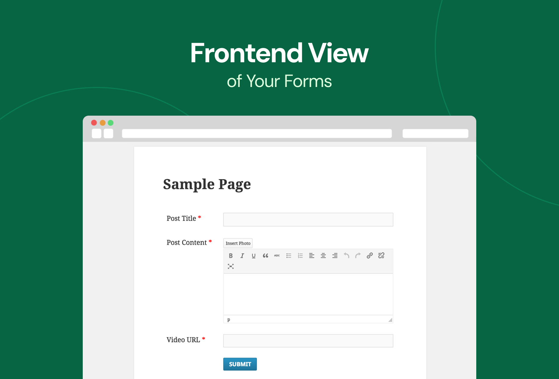 The forms let users create new posts and edit their profile from the site frontend, with no need to access admin panel or backend.