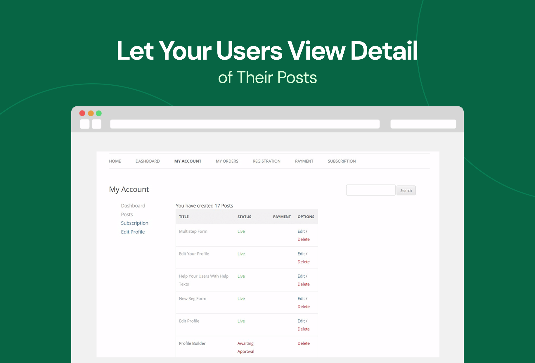 Users can upload images, fill out forms, even enter data with multiple choice menus. Allow users to update their posts from the front end.