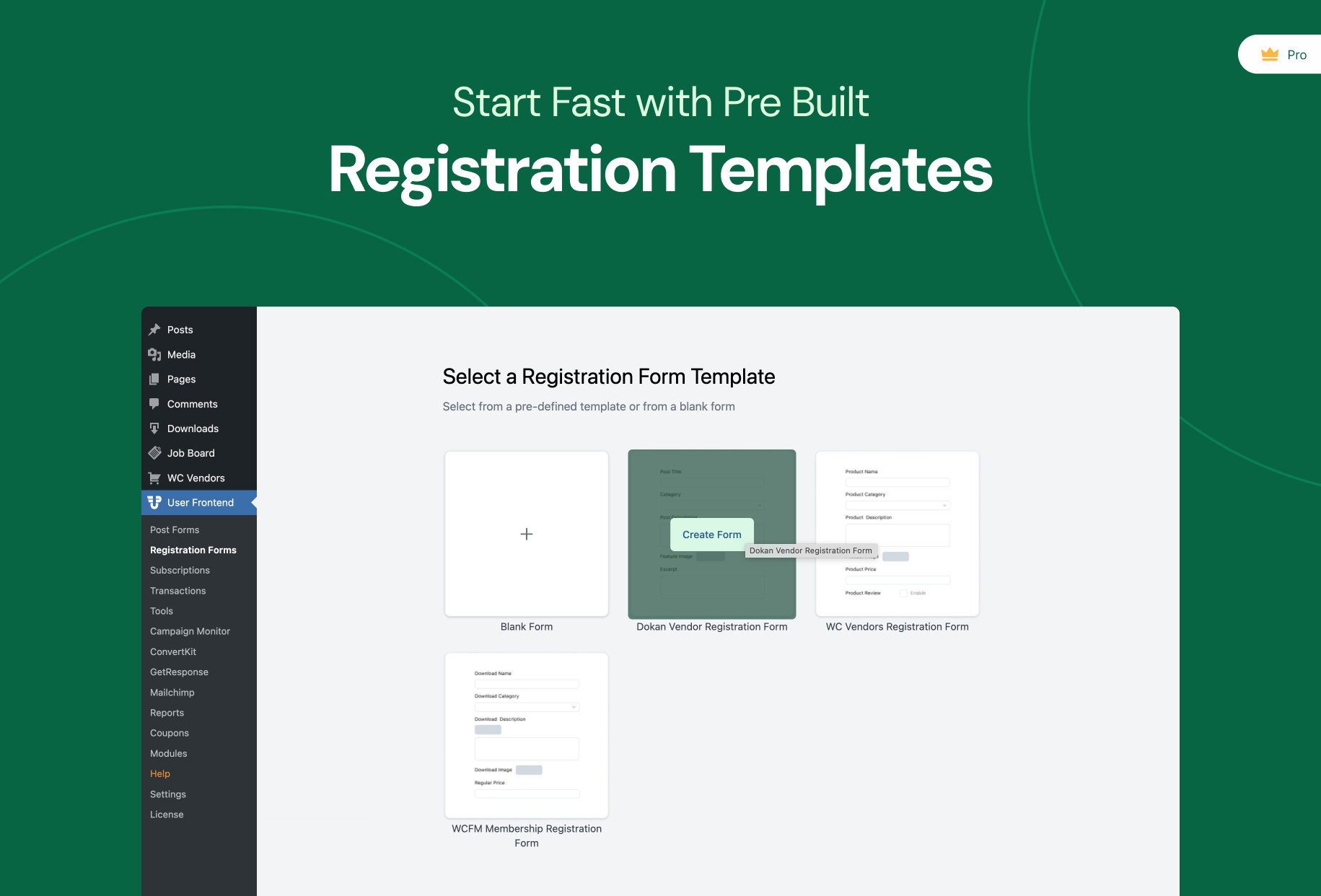 - Form layouts and form templates: Quickly create forms from pre-defined templates. Drag-and-drop fields to customize it further. Vendor registration templates are available for Dokan, WC Marketplace, and WC Vendors.