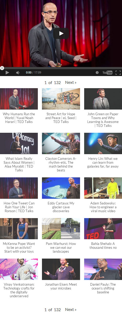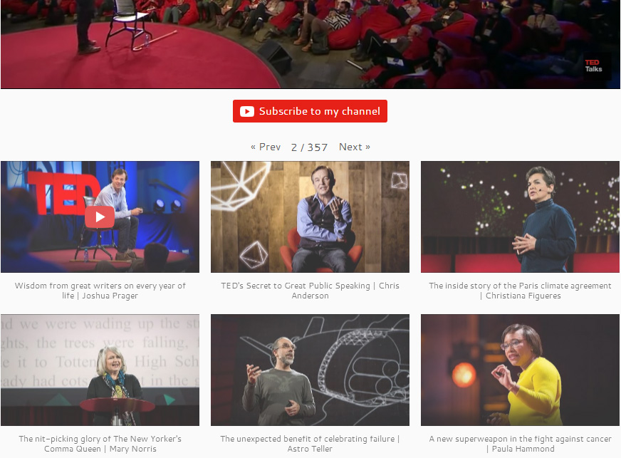 - YouTube gallery capability: channel and playlist – The ability to make playlist and channel embeds have a gallery layout. By default, the plugin can generate a grid-based responsive playlist or channel gallery >>. Your visitors can browse through pages of video thumbnails and choose from videos that are pulled from an entire YouTube channel or playlist.